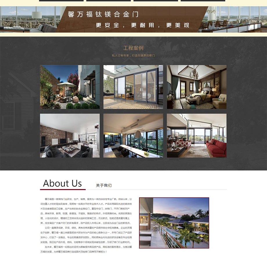 案例介紹:馨萬(wàn)福是一家高檔門(mén)業(yè)研發(fā)、生產(chǎn)、銷(xiāo)售、服務(wù)為一體的綜合性專(zhuān)業(yè)廠家。自始以來(lái),公司注重人才的的吸納及栽培,現(xiàn)擁有一批高水平的專(zhuān)業(yè)技術(shù)人才。產(chǎn)品采用國(guó)際先進(jìn)的噴涂技術(shù)及全套德國(guó)進(jìn)口設(shè)備,生產(chǎn)出來(lái)的鈦合金推拉門(mén),重型中空們,拼格門(mén),平開(kāi)門(mén)等系列產(chǎn)品,具有環(huán)保、耐用、防潮、耐腐蝕、不褪色、隔音好的特點(diǎn),外觀高雅時(shí)尚。優(yōu)質(zhì)的表面處理、人性化的設(shè)計(jì)、精湛的工藝結(jié)合流光溢彩的玻璃工藝,無(wú)論款式、性能還是質(zhì)量均屬上乘,完全滿(mǎn)足廣大客戶(hù)對(duì)門(mén)的所有需求,自產(chǎn)品投入市場(chǎng)以來(lái),立即成為合金門(mén)業(yè)的新亮點(diǎn)